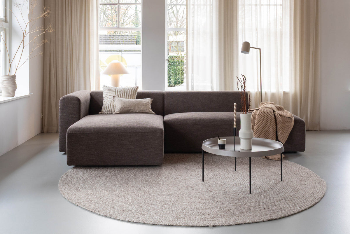 Das Modulsofa Finn besteht aus einem Holzkonstruktion, der mit einer Metall-Nosag-Federung, Bonell-Innenfeder und HR-Kaltschaum ausgestattet ist. Dies ist eine hochwertige Füllung, die im Gebrauch etwas weicher wird. Du sitzt sozusagen auf einem Boxspring.