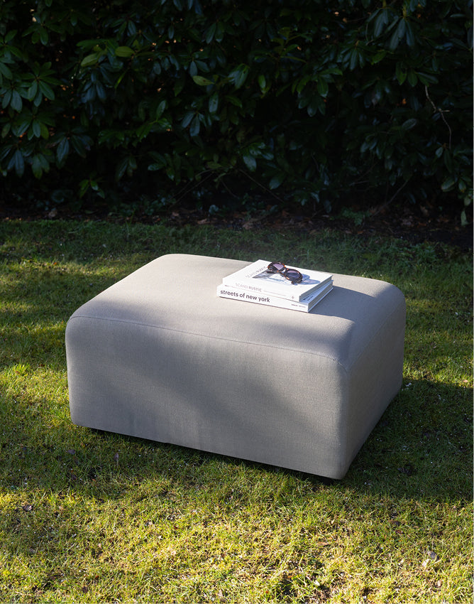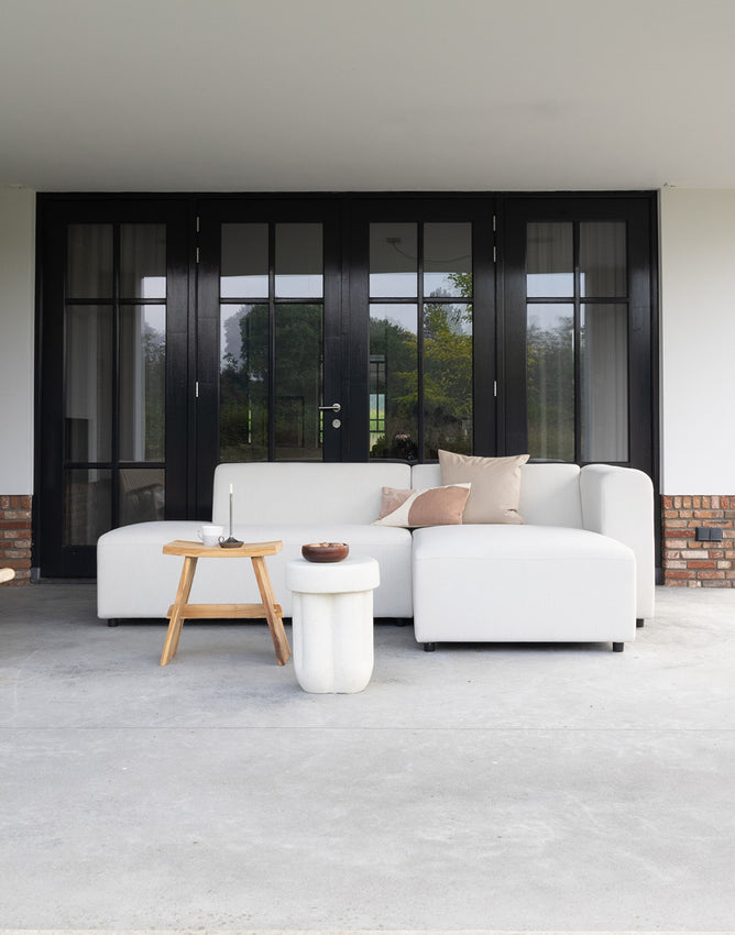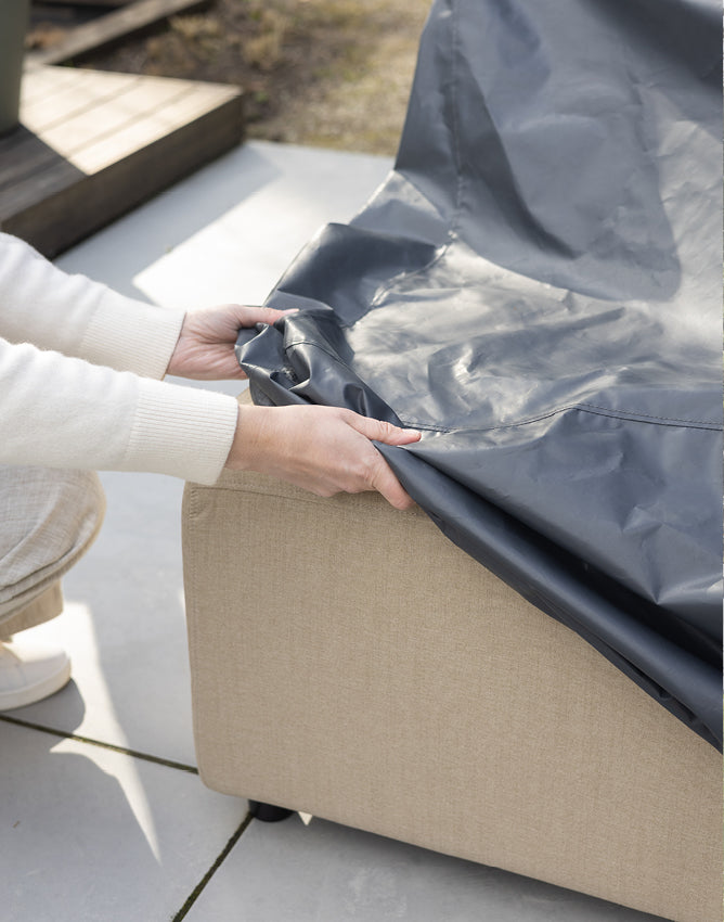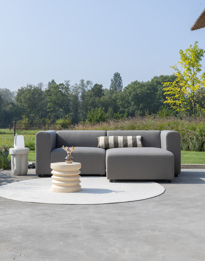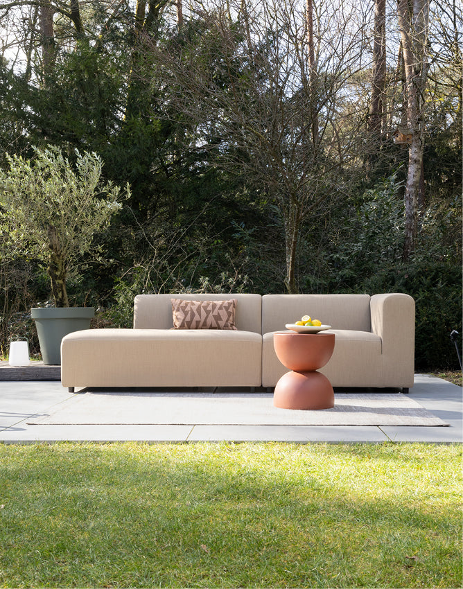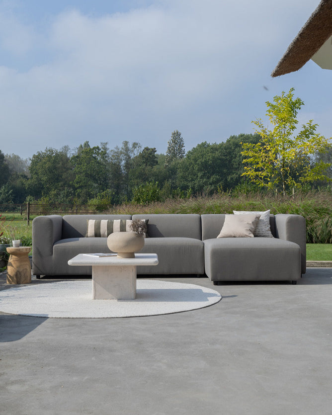 Das modulare Outdoor-Sofa Sol kann das ganze Jahr über draußen bleiben. Der Stoff Era ist fett-, schmutz- und schimmelresistent. Das Sofa ist mit Wasser und Seife leicht zu reinigen. Du kannst auch separate Schutzhüllen für jedes Element kaufen. Eine Schutzhülle ist nicht notwendig, aber wenn du das Sofa jahrelang schön halten möchtest, ist es ratsam, die Sofaelemente im Herbst und Winter einzupacken. Oder sie trocken zu halten, zum Beispiel unter einer Überdachung.