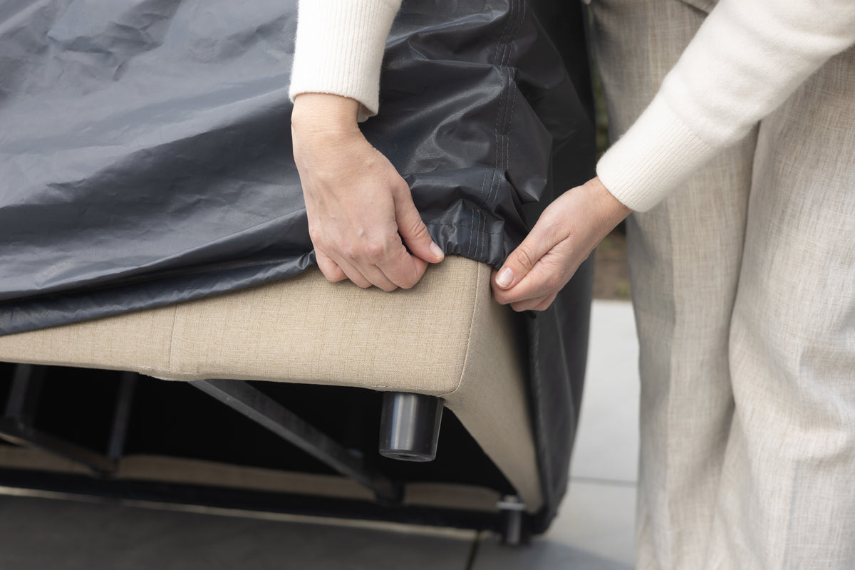 Die Schutzhüllen für das Outdoor-Sofa Sol sind aus speziellem All Weather- Stoff gefertigt. Es ist ein glatter Stoff, der leicht mit einem Schwamm oder einer weichen Bürste und lauwarmer (grüner) Seife gereinigt werden kann. All Weather-Stoff kann sogar mit einem Hochdruckreiniger behandelt werden.